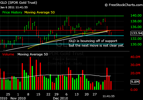 Gold as represented by the GLD in the chart below has closed below the 50 day moving average, which excites the Bears. Although gold could simply continue down here, we have to askwhat could support a rally on a technical basis?