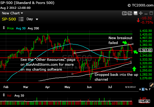 UPDATE AFTER CLOSE ON 8-02-2012: The SP500 Index has now failed the prior breakout above the previous July high as shown in the chart below and has moved back into the up channel. The ECB (European Central Bank) failed to take action today, and that is blamed for the fall in the market. It can drop to the base of that channel, the upwardly sloping red line, and still be in an up trend. The aqua 50 day moving average could also contain this pullback. Below there, the May or June low becomes the target. More below…