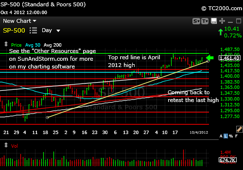 UPDATE for 10-04-2012 @ 9:55 pm: The SP500 Index has found support after a brief and shallow correction. It has the ability to at least retop as the chart shows below.