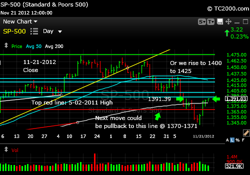 UPDATE for 11-22-2012 based on 11-21-2012 Close: We either go down to retest at 1370ish or lower or have one more push up to 1400-1425 and then another serious corrective move.