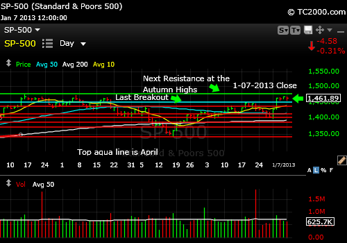UPDATE 1-07-2013 after the close: Today’s little pullback was “noise.” The market stayed within the market timing price range of the prior two days as shown on the chart below. In fact, it can retest the breakout at the top aqua line and then rally. The real issue is whether earnings will turn this into a temporary top in the market or allow for a breakout. More aggressive traders could sell some or all of their positions as close to the recent high as possible and rebuy a higher close above the overhead resistance line shown below.