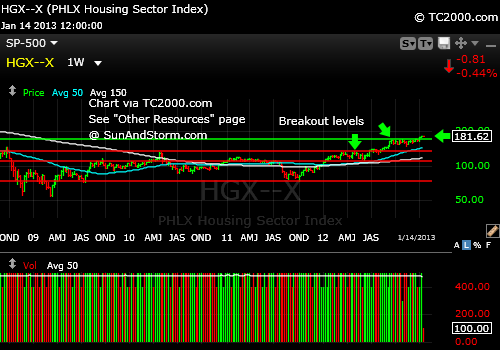 Finally, investor sentiment, namely the AAII survey of Individual Investor Sentiment says to me that there are too many Bulls at the moment, not at a huge extreme, but meeting the same state as on 12-20-2012, so sentiment predicts a correction from here to around 1430ish by my reading of the chart. The Bull Bear spread is 19.5% this week up from 2.5% in just one week. That’s too much too fast. No number is a perfect predictor, so follow the charts and see if the current highs hold or if there is a feeling conveyed by the stock market action implying “blue skies ahead for 2013.”