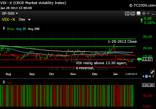UPDATE 1-28-2013 @ 9:49 pm ET: The VIX failed to maintain its fall below support at 13.30 today, but is barely above it as this chart shows. It needs to fall again below that level for the rally to be sustained. A rising VIX means investors are starting to hedge their positions in the market and have an eye on the exit.