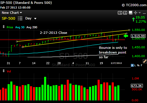 UPDATE 2-28-2013 @ 12:11 am updated @ 9:24 am: The further bounce in the SP500 Index has fallen short of the breakdown point at the base of the channel as shown in the chart below, so there is certainly no point in buying until that strength is shown. I would say that despite the emotional indecision in the market, the Bears still have the ball. The lower channel line must be exceeded to give control to the Bulls and would like result in a retopping at the recent daily high if it were to happen.
