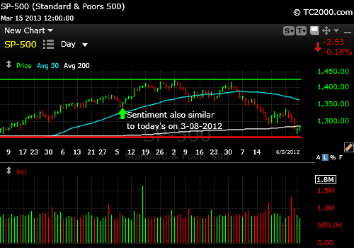 In the above March 2012 scenario, first note that the time of year is identical. We are headed back to the “go away in May period.” That would give us about 9 more good market days with continued positive sentiment in the teens followed by marginal new highs up to about April 1st followed by a decline. Note the lower high in the above chart which occurred on May 1st, the perfect “go away in May time.” I expect the market to have some trouble that will start in 10 market days or fewer based on current sentiment. If a correction starts right away (within the next market week), we could then TOP the 2007 highs before ending the rally and seeing a more substantial 7-10% correction. So an immediate correction will allow more for the Bulls than one that is delayed another 9-10 market days.