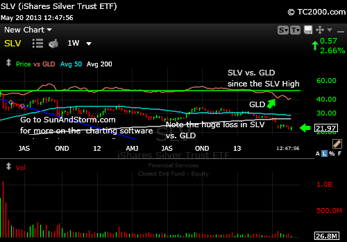 UPDATE for 5-20-2013 @ 12:51 pm: This chart shows why silver is a better buy than gold, but both are buys on a trading basis WITH a stop in place. See my tweets for more to right side of this page (see link). More tonight… Here is the chart: