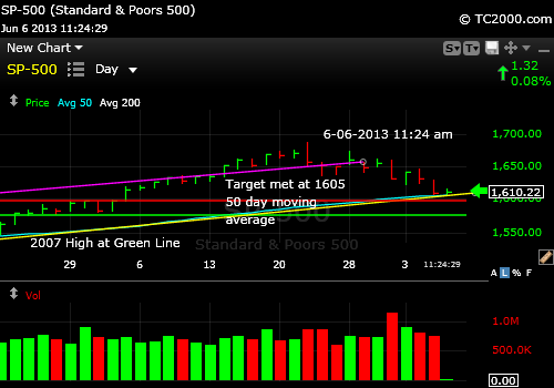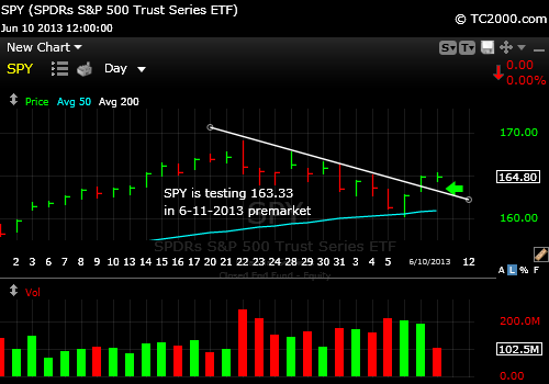 UPDATE 9:20 am 6-11-2013: The SP500 Index is testing the low from Friday this morning (base of current consolidation you could say; now lower at SPY 163.20 as I type with low 163.14) and must hold that level or thereabouts or it will likely just retest the prior low near 1600. Whether it will hold twice we don’t know, so watch your stops!