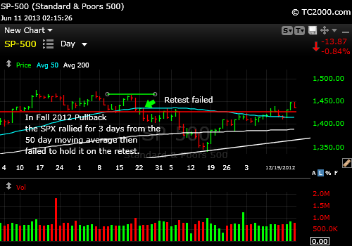 UPDATE for 6-12-2013 @12:00 am: Take a look at the second chart below. It will show you what is likely to happen over the next few days to weeks. I checked EVERY retest of the 50 day moving average since 10-2007.