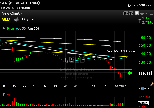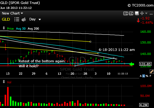 UPDATE 6-10-2013 @ 11:33 am: So far GLD has held 132.80 support on a test (the red line on the chart below), a positive in the move up from the 5-20-2013 low.