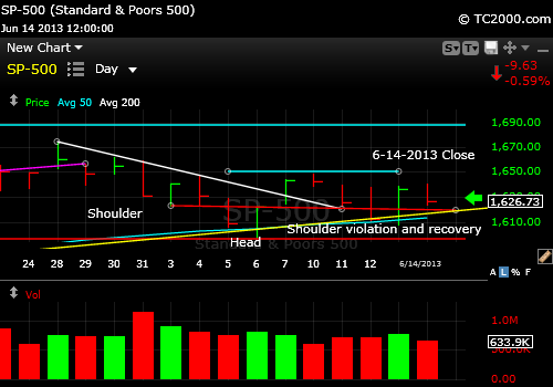 UPDATE for 6-19-2013 @ 8:15 pm: The breakout above the top aqua line in the chart below is NULL and VOID for now. That can of course change daily when the market is as volatile as it’s been. The SP500 Index fell after traders decided that despite the Fed had told them everything before, they needed to hear it one more time. Well maybe. Many times the first reaction to Fed speak is wrong.