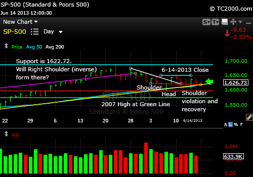 UPDATE #2 for 6-17-2013 @ 7:20 p.m.: The SP500 Index made some progress today and then gave too much back in my opinion to sustain the rally. Here’s the chart (note that you’ll be able to see the rest of the white text in the chart below this one):