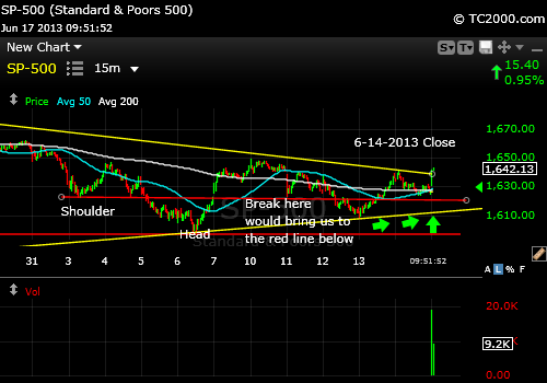 UPDATE for 6-17-2013 @ 9:44 a.m.: The positive this a.m. is the move over the yellow down trend line forming the top of a triangle or pennant formation on the following 15 min chart of the SP500 Index. Realize there is immediate resistance above here at 1648.69 and a move above there would be a more convincing buying point. This does represent progress for the Bulls, who will point to “holding the 50 day moving average support.”