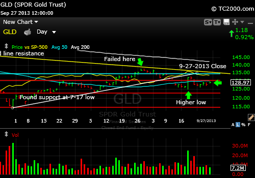 UPDATE @9:55 a.m. on 9-30-2013: Gold and silver are down this morning as rates are down only a little, 0.15% to a 10 Year Treasury rate of 2.614%. Perhaps the metals wanted a strong Treasury rally and did not get it (I make that point in regard to falling rates below.) Regardless, my “strength test” noted in the first paragraph below still applies, and gold is NOT a buy here unless you plan on using a nearby stop.