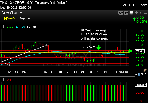 The 10 Year Treasury yield playing with a specific number on the chart and that is the 10-16-13 yield high of 2.757%. Above there and rates are technically rising and below there, which we are at the moment, rates certainly have a chance to fall. After all Santa Ben is there with his big bag of US dollars. A QE taper in December would shock the markets by the way, if you are looking for a reason for a sharp correction in stocks.