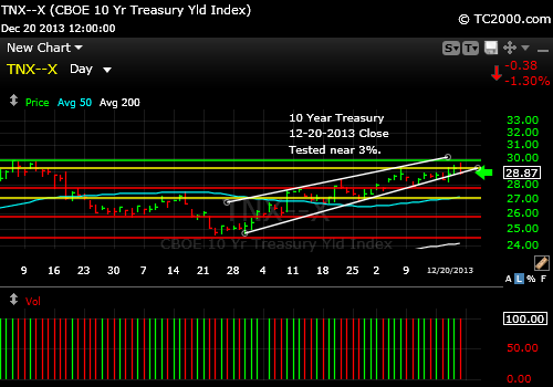 The 10 Year Treasury yield tested the prior high in the 3% area after the Fed announcement that their dollar busting Quantitative Easing program will be scaled back by 10 billion of the current 85 billion US dollars in January. Few expected it. It does displace the full blame for the “QE Taper” from the incoming Chair of the Fed, Dr. Janet Yellen.