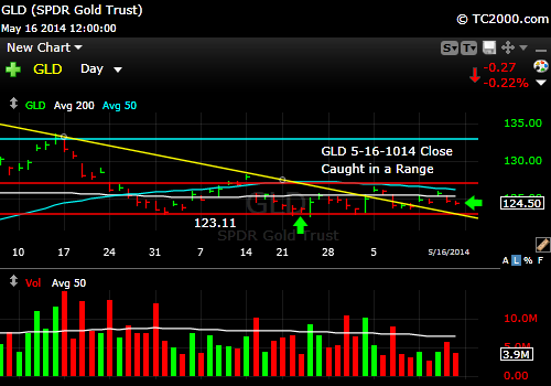 In the meantime, gold (GLD) is stuck as well, stuck in a range from which it needs to break out (click to enlarge):
