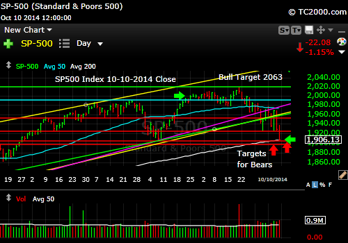 The SP500 Index fell to my 1905ish target on Friday. That COULD be it for this swoon. The script is that bounces occur even during the beginning of a Bear market. Is this a Bear? No one can tell you except after the fact, so don’t concern yourself with that speculation. Protect profits where you have them (unless we do in fact bounce Monday) and protect capital by removing some from the markets ONLY if you are willing to rebuy higher if you are dead wrong and end up selling at a low. I would buy this level only if I were willing to sell it below the next level of support shown on the chart below. Otherwise why bother?