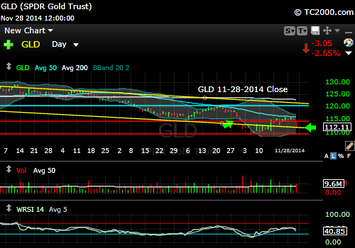 The Gold ETF Chart (GLD; click to enlarge the chart): Gold fell due to one major event, namely, the OPEC decision to allow oil prices to tank further. This may seem good short term for U.S. consumers, but their intention is clearly to put oil shale businesses out of business in the U.S. and some speculate to hurt the Russians and Iranians as well who are supportive of Syria’s Assad. It hurts U.S. employment in the energy industry. Lower oil prices also mean lower prices for many goods, and hence deflation, which is not what the world needs right now according to every Central Banker who breathes oxygen. They want growth with mild inflation.