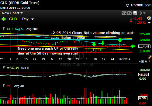 The Gold ETF Chart (GLD; click to enlarge the chart): Last week gold firmed up finally. As I published on 12-01, GLD has seen increases in volume with each thrust up, but needs to move through the 50 day moving average soon or this rally could die right here. Spot gold played briefly with 1200 and is now back below that level.