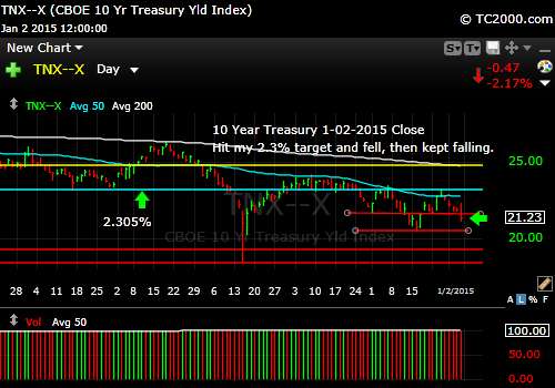 The 10 Year Treasury interest rate (TNX, tracked by TLT if Bullish; TBT if Bearish): The 10 Year yield rose to my 2.3% target and pulled back. The rally DID resume from there as predicted last week (falling yields).