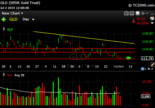 2. Gold did NOT respond to Greece and the potential trouble for the Euro, which is negative. We are on the sidelines as far as a gold trade goes. If you have no exposure to gold (we are using it as insurance against the U.S. dollar and our Fed’s demonstrated intention to debase our currency in support of “full employment” of course), the best set-up is to add GLD here and toward the deeper lows (109.67-109.77) and sell if there is a significant breach of that low.