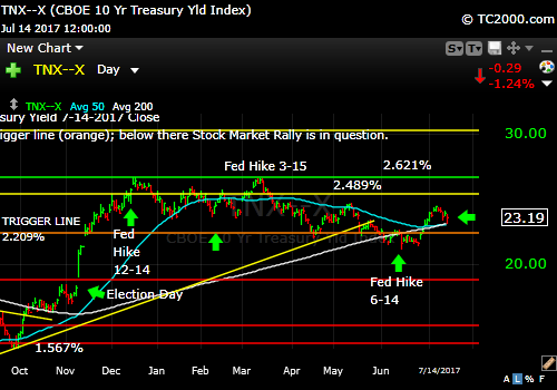 Market timing the U.S. 10 Year Treasury Yield Index (TLT, TNX, TYX). Rates falling again but above trigger.
