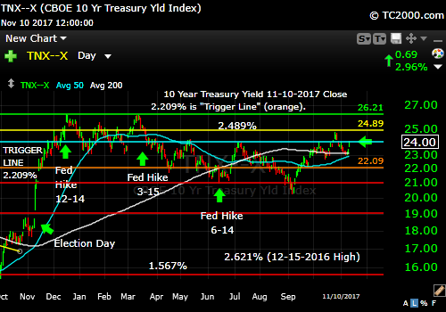 Market timing the U.S. 10 Year Treasury Yield Index (TLT, TNX, TYX). Rates rising and testing market timing resistance.