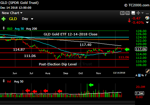 Market timing the gold ETF (GLD). Gold slips a bit. Still off the lows however.