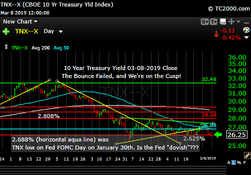Market timing the US 10 Year Treasury Yield (TNX, TYX, TLT, IEF). Rates back down at the low end of the range.