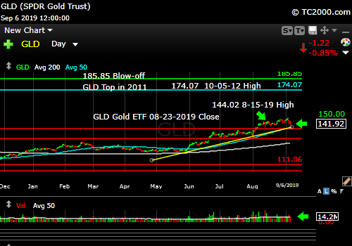 Market timing the gold ETF (GLD). Gold slipping a bit, but still in an uptrend.