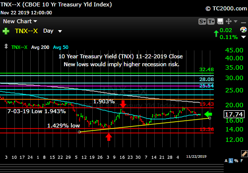 Market timing the US 10 Year Treasury Yield (TNX, TYX, TLT, IEF). Rates down but in up trend at the moment.