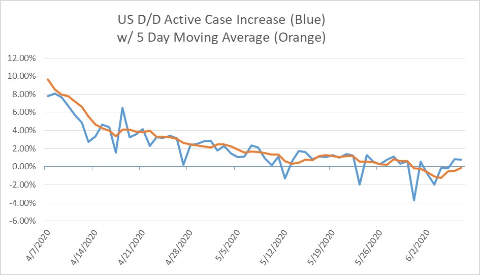 US COVID19 Day Over Day % Increase in Active Cases for 6-07-20