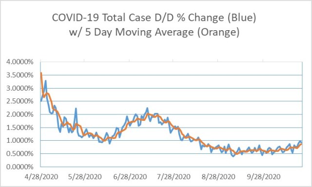 10-25-2020 COVID-19 Update: The failure to contain COVID-19 will likely determine both the outcome of the U.S. election generate market timing signals in the near term. Both Total and Active Case numbers are on the rise again in the US as you can see the new recent highs coming up off the recent lows, which is evident in both the raw numbers (blue lines) as well as the 5-day moving averages (orange lines). What I am plotting is the rate of change from day to day. A rising line means an acceleration is occurring (cases are not just still showing up, they are showing up in greater and greater numbers)…