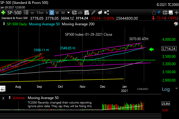 Market timing the SP500 Index (SPY, SPX). The immediate trend is broken, but not the longer term trend.