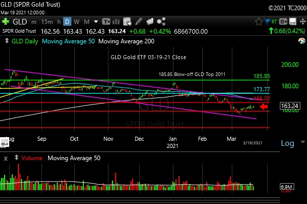 Market timing the gold ETF (GLD). Gold is mid channel in a long down trend.